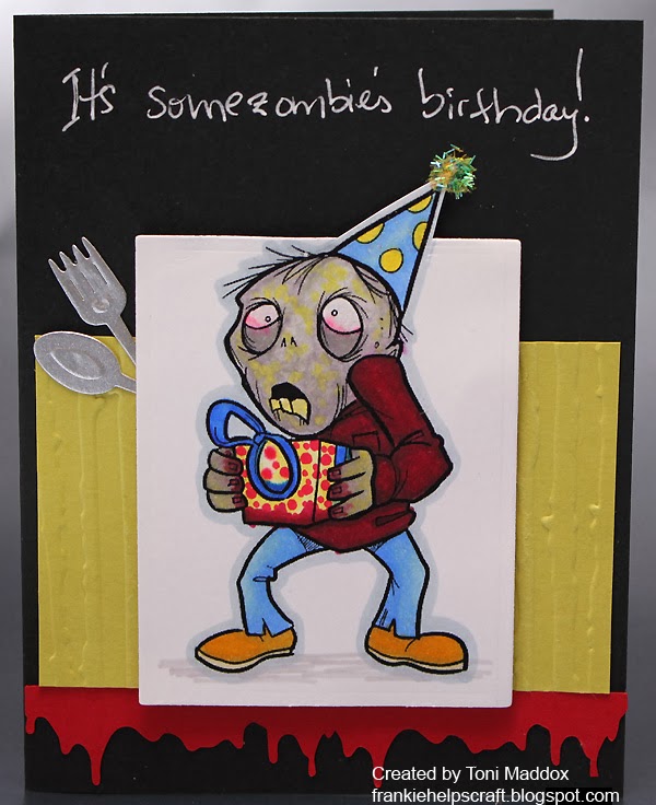 ReplyDeleteFabulous card Toni :-) the zombie is very scary with his gift dripping with blood ,, haha :-) LOVE it :-)