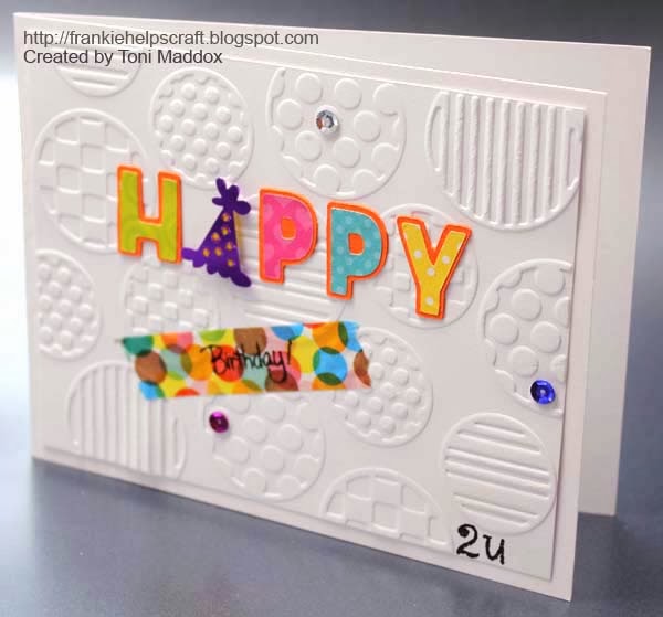 The Details: PP scraps, washi tape, Stazon, birthday hat confetti, leftover Cricut-cut letters, Paper Studio embossing folder, PTI white card stock, Glossy Accents, Hero Arts letter stamps, Stampendous Birthday stamp.