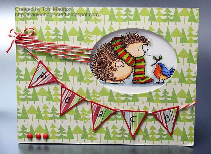 The Details: Paper Studio PP, Spectrum Noirs, Darice brads, bakers twine, foam dots, Spellbinders oval die, PTI white cardstock for base and banner die, Hero Arts letters, Penny Black Christmas Friends