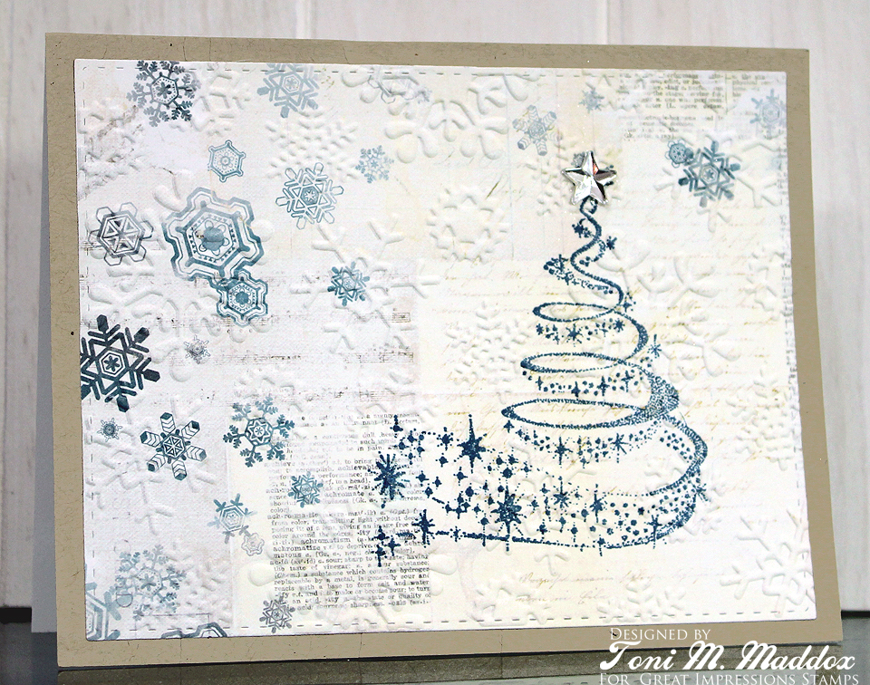 I've made not one, not two, but THREE cards this round. First up, I had to have the H203 Magical Tree stamp the moment I saw it.  It's so gorgeous!  I had a bunch of ideas but settled on this one.Here I used designer paper that had the look of layered stamping without all the fuss and muss.  I then stamped the tree using a matching blue.  I decided to emboss the panel for textural interest before adding the Tim Holtz star.