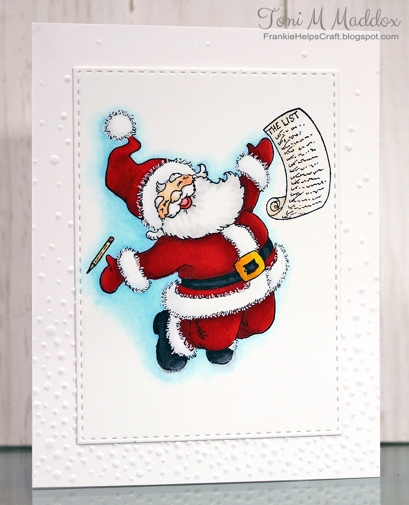 Awesome coloring, Toni! Mr.Santa looks so happy on your beautiful snowy white card:) !!! Have a wonderful week!