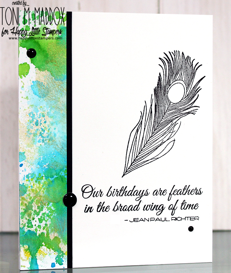 The Details: Distress Inks, Peerless liquid gold, VersaFine Onyx Black, Tim Holtz watercolor paper, Recollections 110lb white cardstock, Clearly Besotted Fancy Feathers