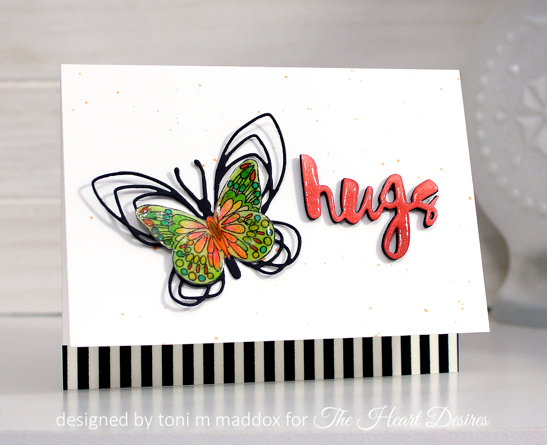 The Details: Concord & Ninth Floral and Flutter dies, Hero Arts ombre ink butterbar to orange, Doodlebug Black & White Striped Washi, Glossy Accents, Ranger Multi Medium Matte, Wink of Stella clear, Impress Coloring Book stamps, Zigs, Simon Says watercolor hugs die, Recollections 110lb white cardstock
