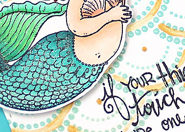 The Details: Penny Black Mermaids, Carta Bella Deco Dots, Copics, Peerless Transparent Metallic Gold, VersaFine Onyx Black, Distress Inks Evergreen Bough and Tumbled Glass, Wink of Stella, Impression Obsession sentiment, Papertrey Ink Hawaiian Shores cardstock, Simon Says stitched rectangle die