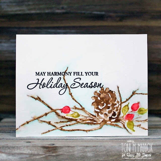 The Details: Hero Arts Very Merry Christmas, Penny Black Cones & Berries cling stamp, Distress Markers, VersaFine Onyx Black, Tim Holtz Watercolor paper, Zig (for the blue background)