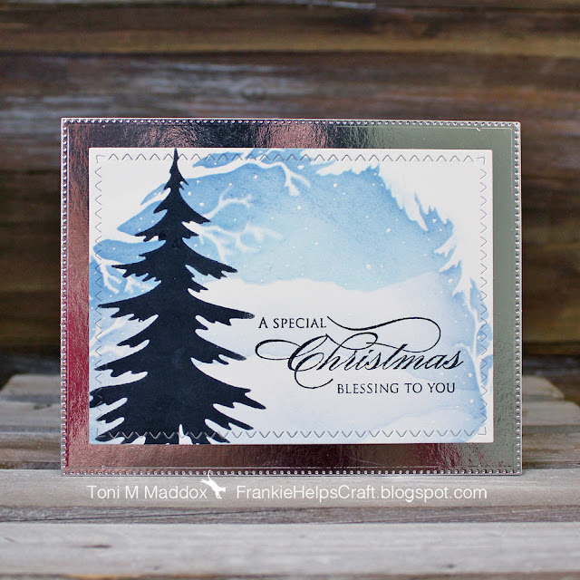 Card 2 Details: Penny Black Festive Cheer, Waffle Flower Lacy Layers die, VersaFine Onyx Black, Clarity Woodland Stencil and Brushes, Distress Ink Faded Jeans and Tumbled Glass, SugarPea Designs Border die