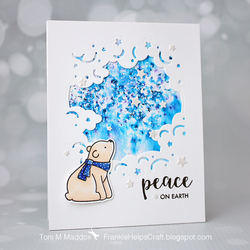 The Details: Avery Elle Merriest and Winter Woodland Wonders, Hero Arts August 2017 Kit Window Cut Die, Memento Tuxedo Black, Versafine Onyx Black, Wink of Stella Clear, Brushos Ultra Marine, Copics, Ranger Multi Medium Matte and Watercolor Cardstock