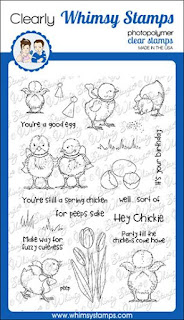 For today's card I'm using the Whimsy March release Spring Chickens which are just too too cute. The Criss Cross Gingham Background goes perfectly with them, don't you think? I stamped that with Distress Oxide Mustard Seed onto the card base.